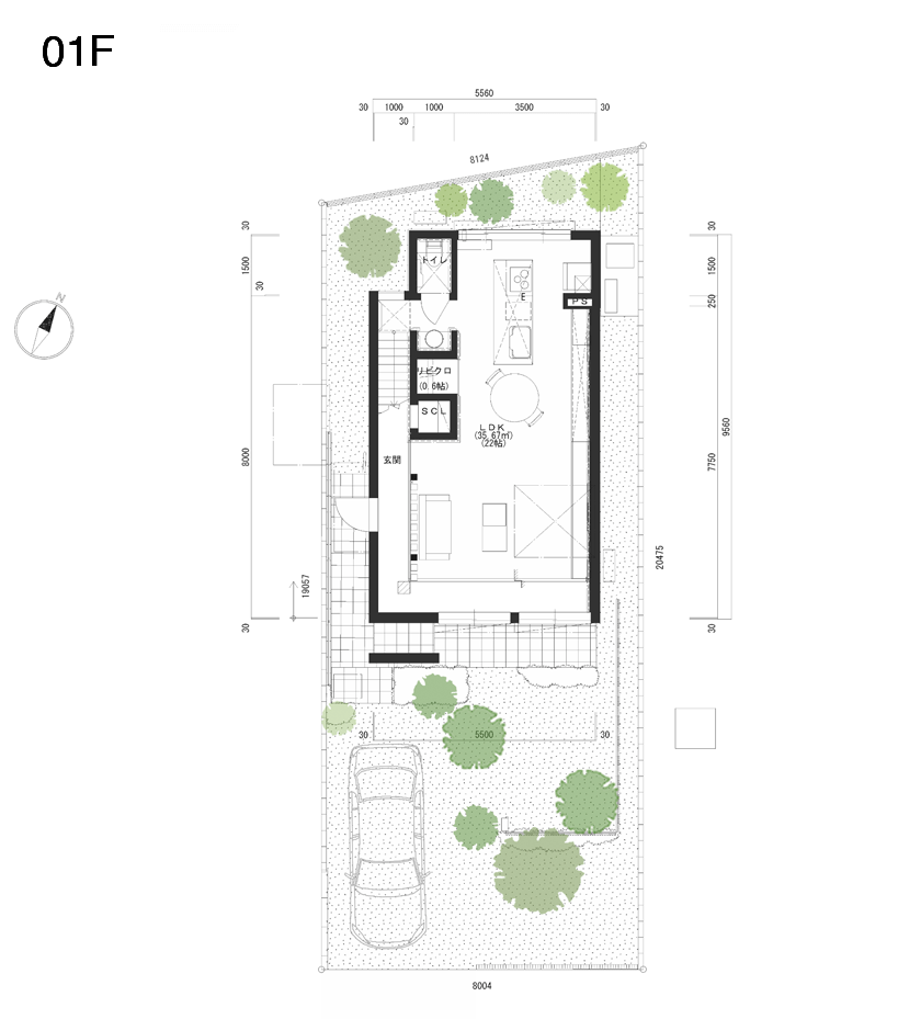 建築地は、分譲地の1区画。南に道路、東西北に隣家。