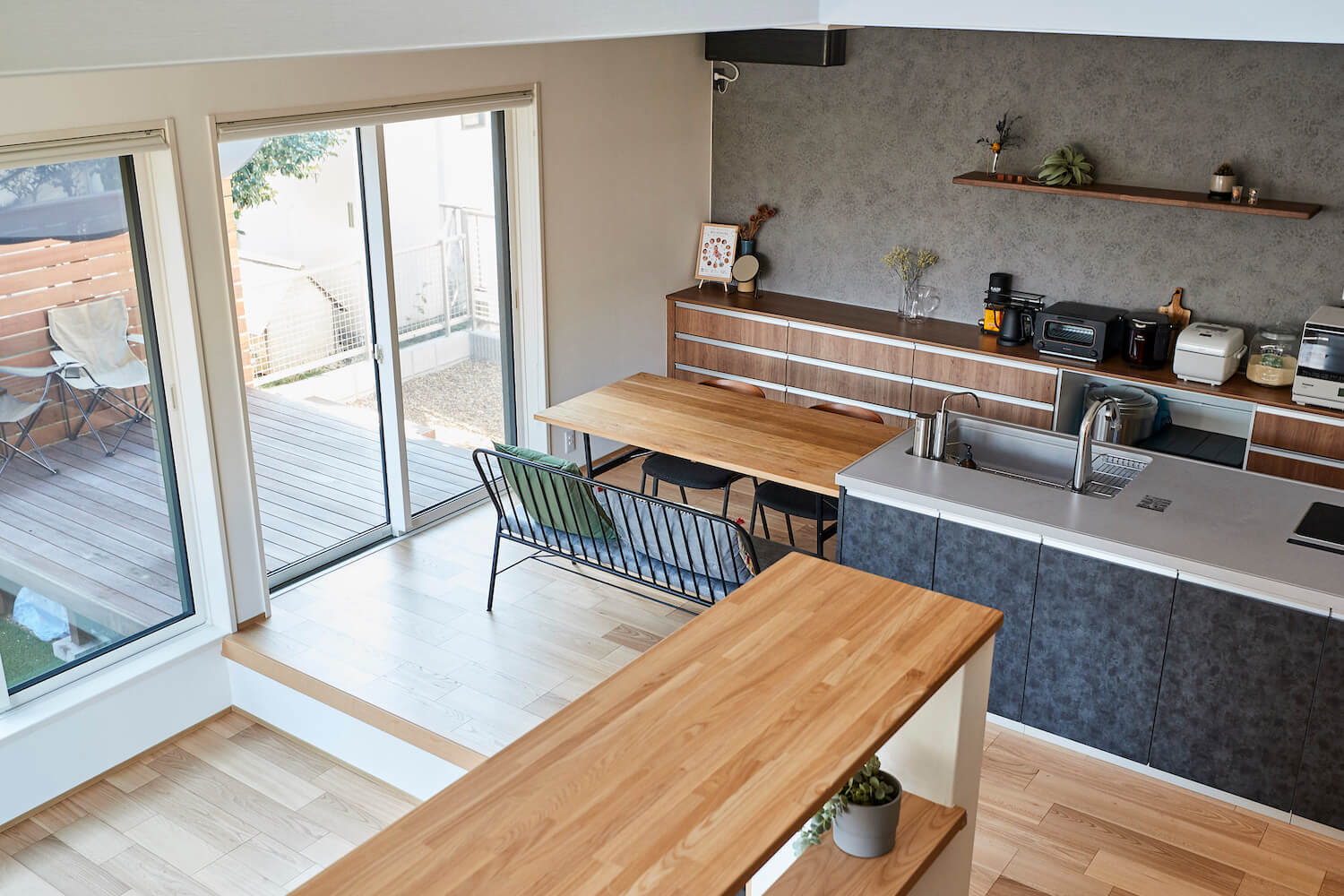 キッチンからは全体を見渡せ、ダイニングと横並びにすることで家事ラクに。