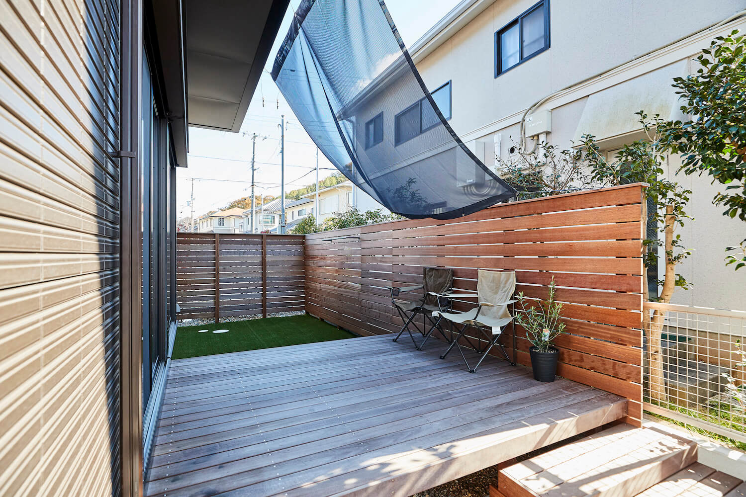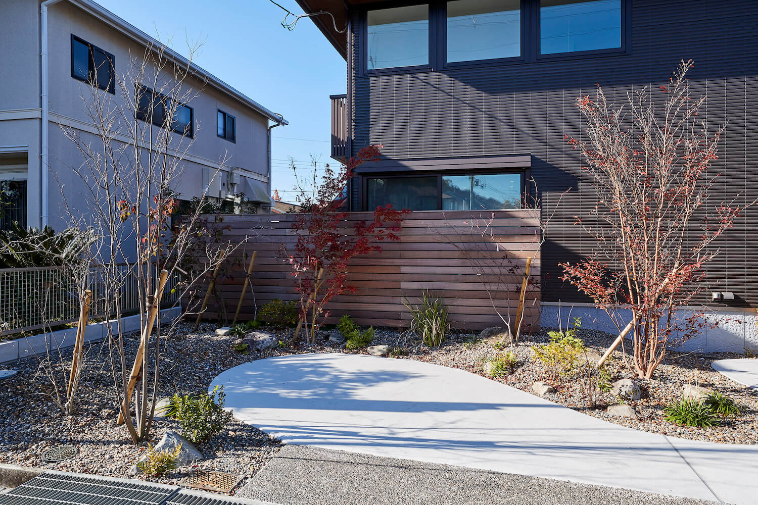 外観は、目隠しフェンスを活かした外構に2台の駐車を計画。