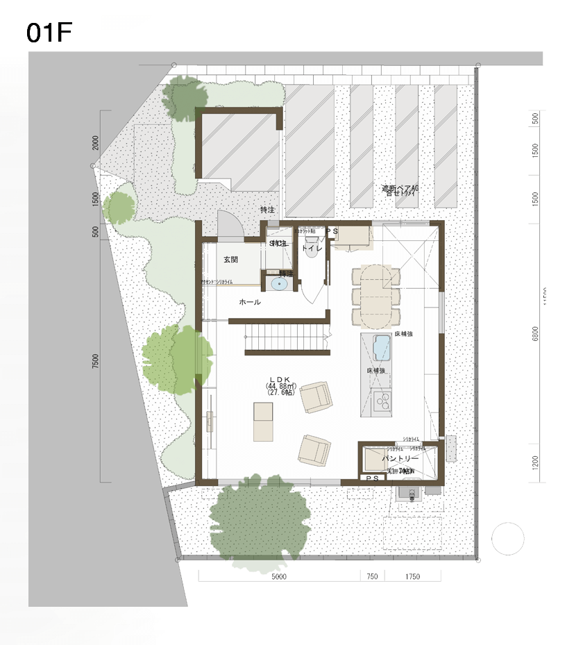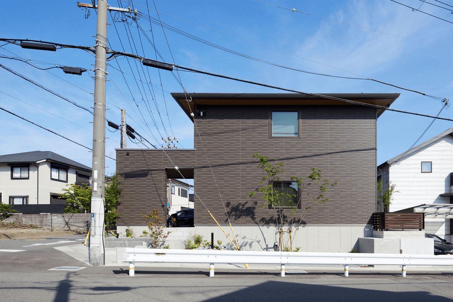 少し蛇行している道路から抜ける空が眺められるので、南側にリビングを配置することが最初に決定しました。