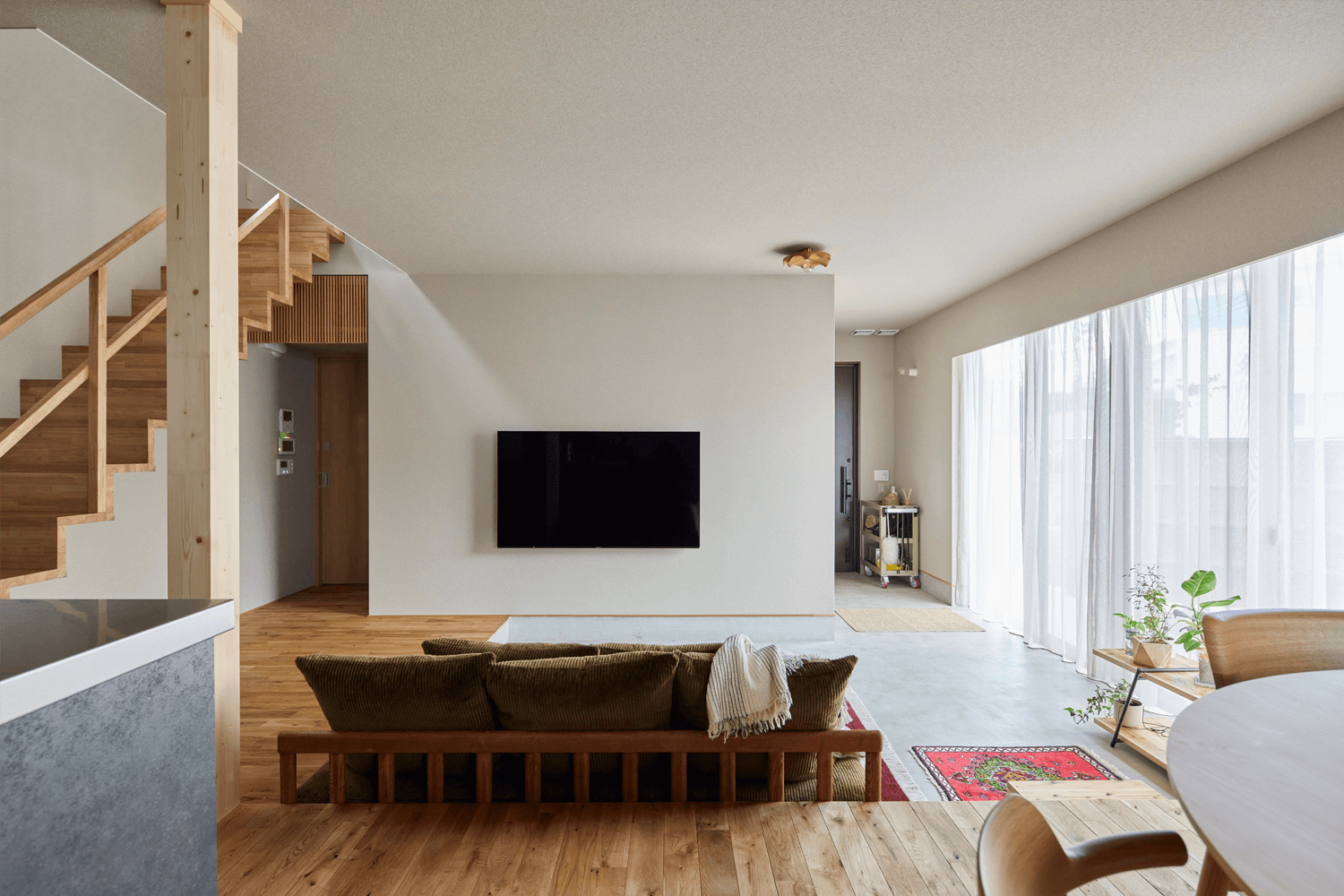 #土間 #土間テラス #庭 #土間リビング #無垢床 #ナラ材 #ペニンシュラキッチン #シースルー階段 #造作階段 #壁掛けテレビ #デザイン照明 #造作洗面 #トモイエDesign Plan