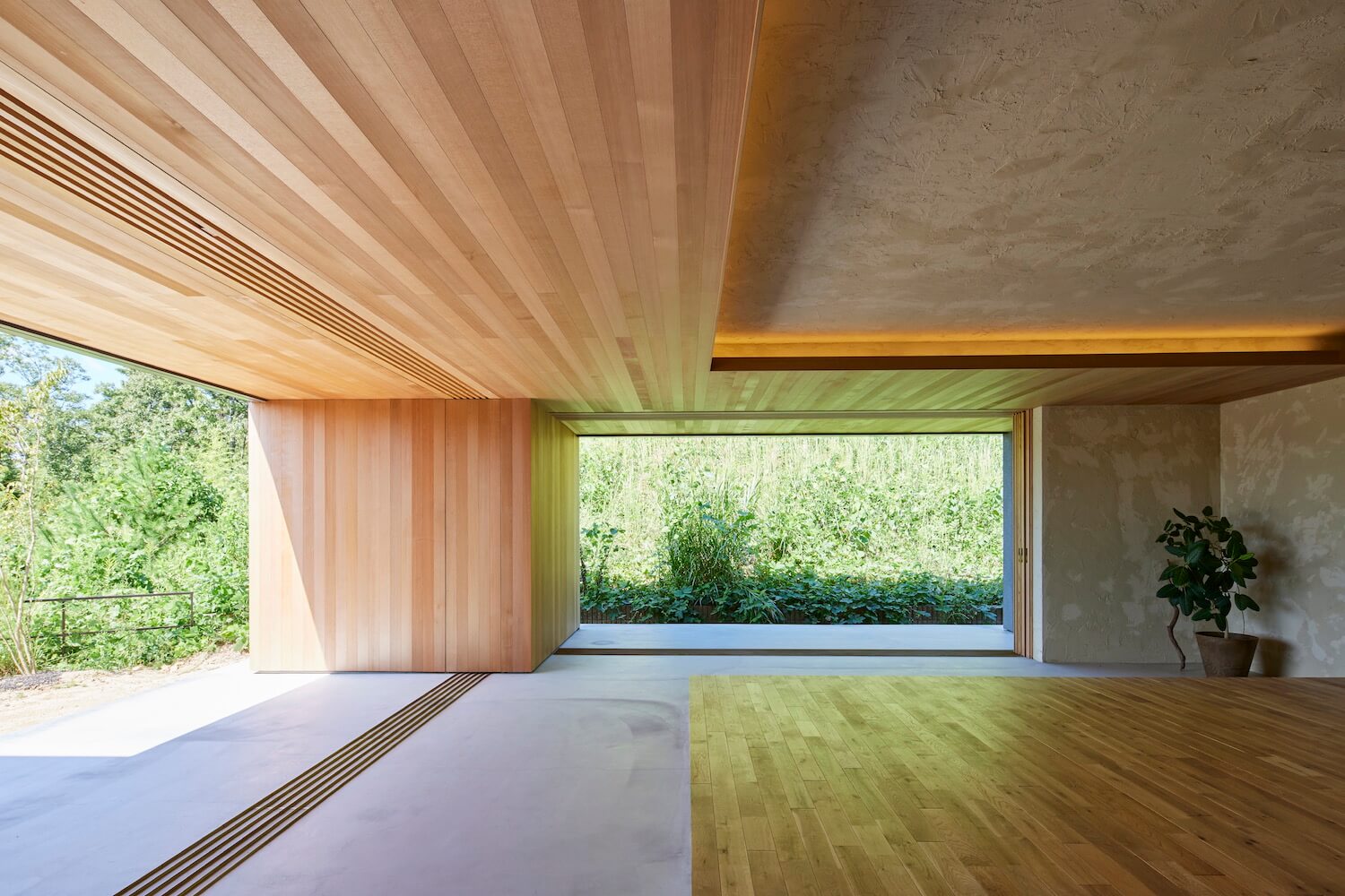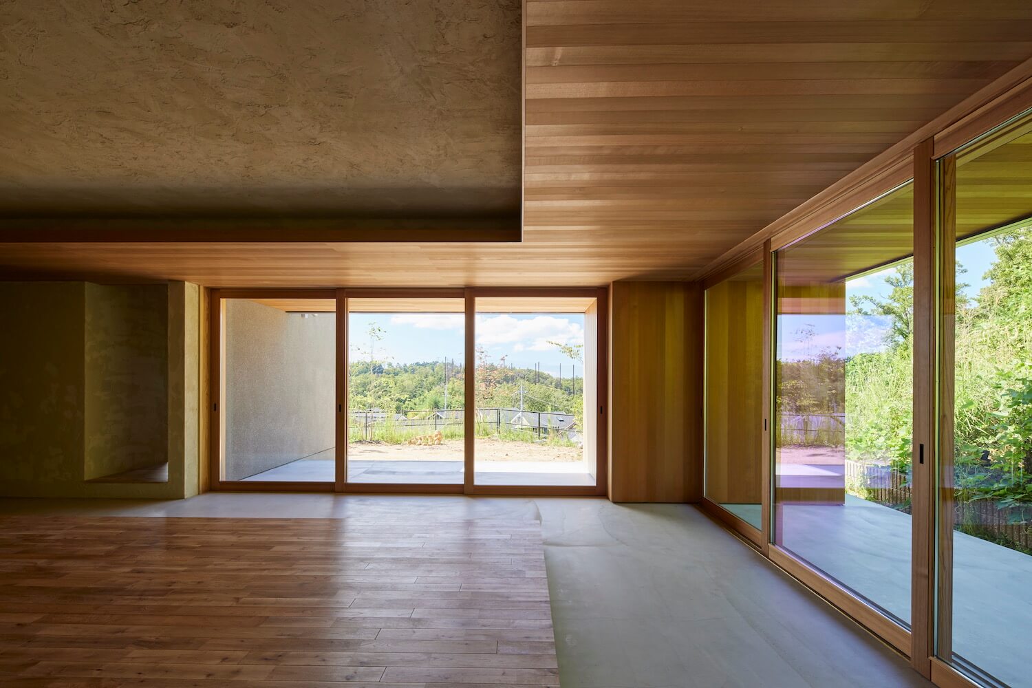 #シャーウッド #無垢床 #ナラ材 #塗り壁 #シラス壁 #高千穂シラス #間接照明 #土間 #土間テラス #大開口 #木製建具 #レッドシダー #吹付仕上 #グレー #平屋 #里楽 #借景