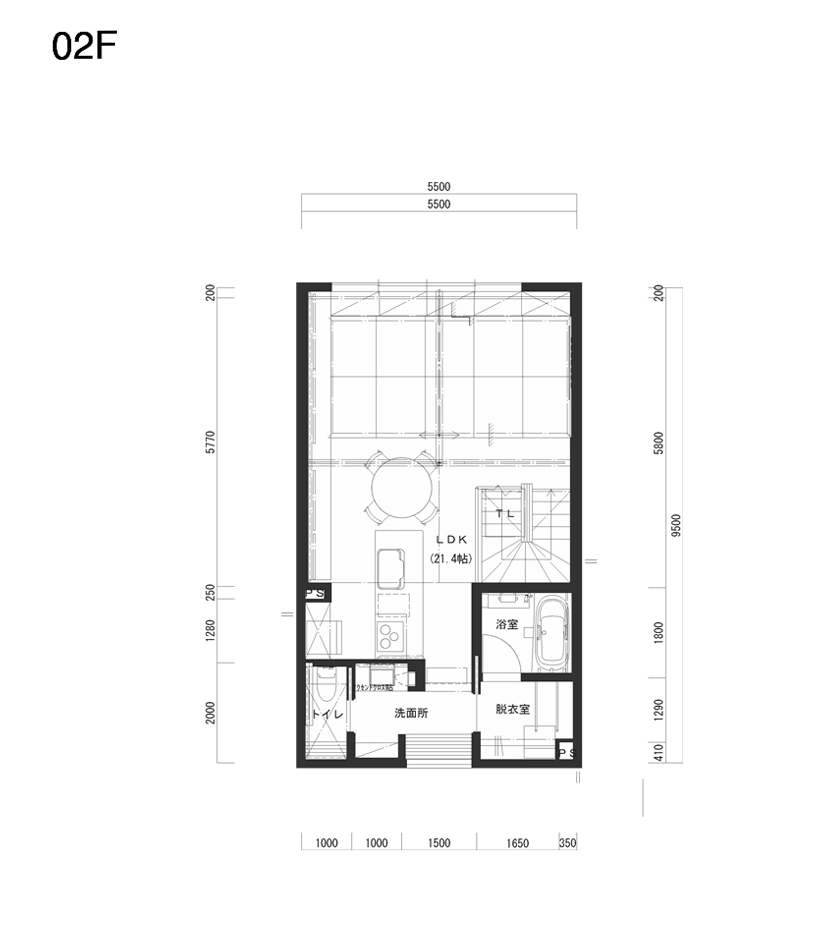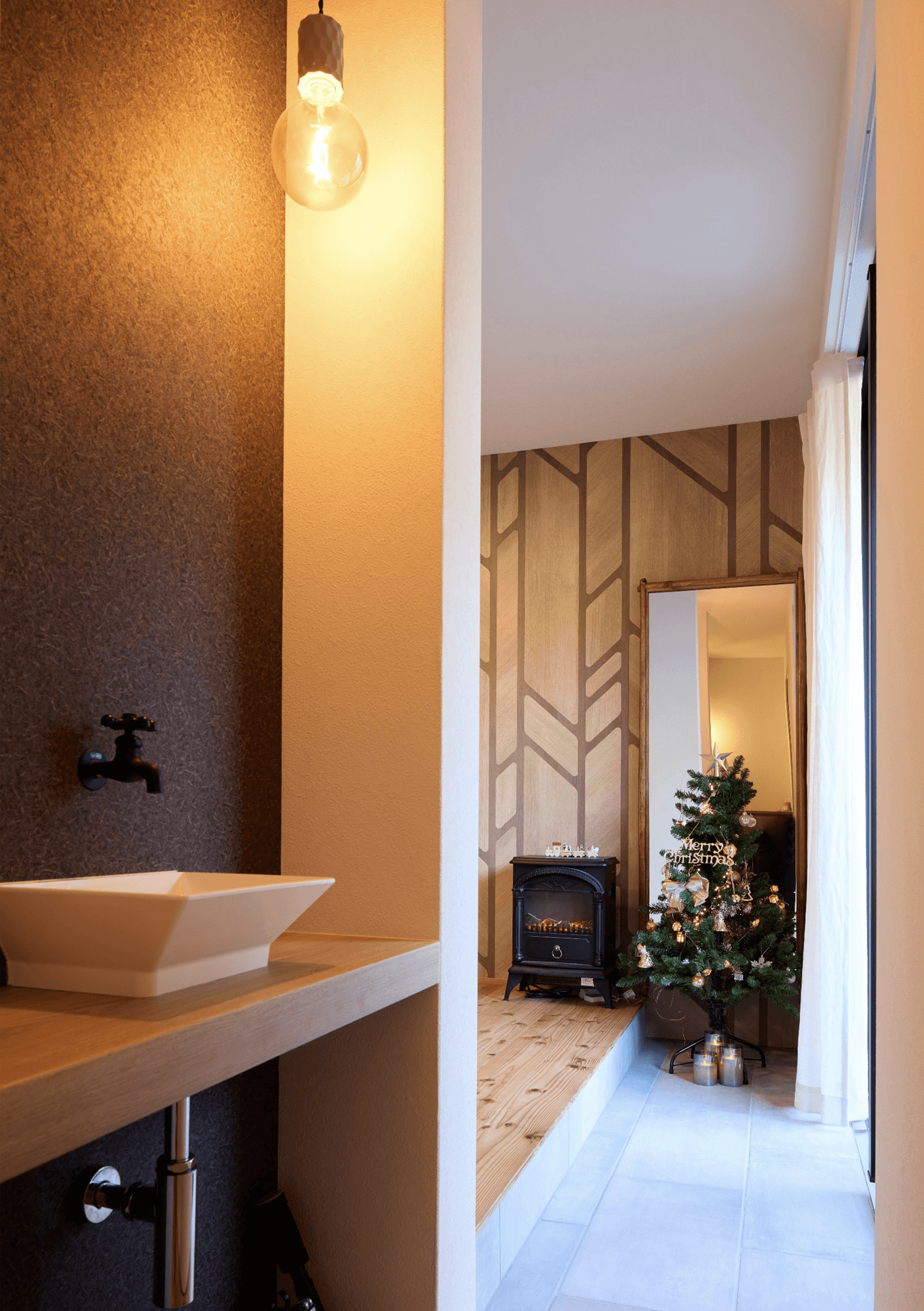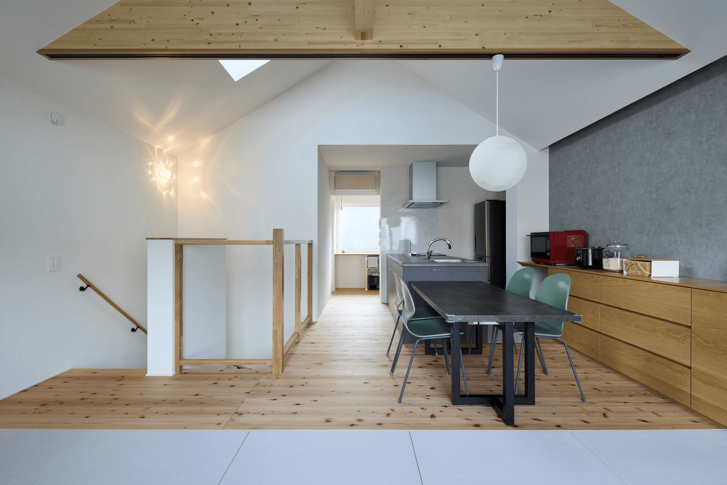 天井は、空間の広がりをより感じていただけるよう、開放感のある勾配天井に仕上げました。