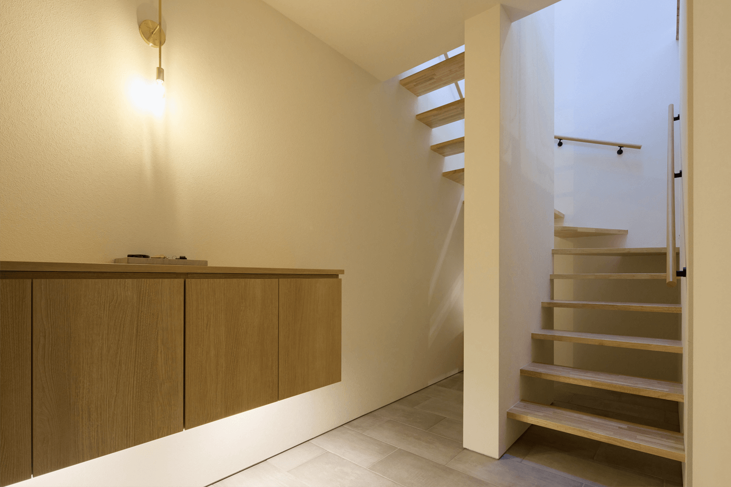 またアプローチを抜け、玄関に入ると、タイル土間とシースルー階段が奥までドーンと抜けています。
