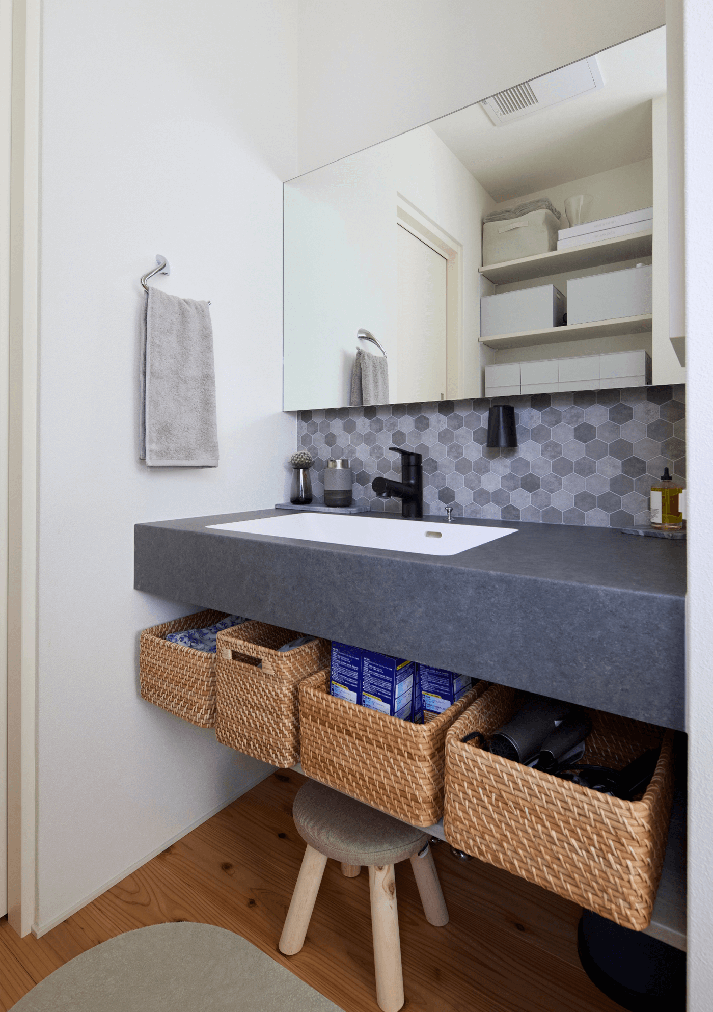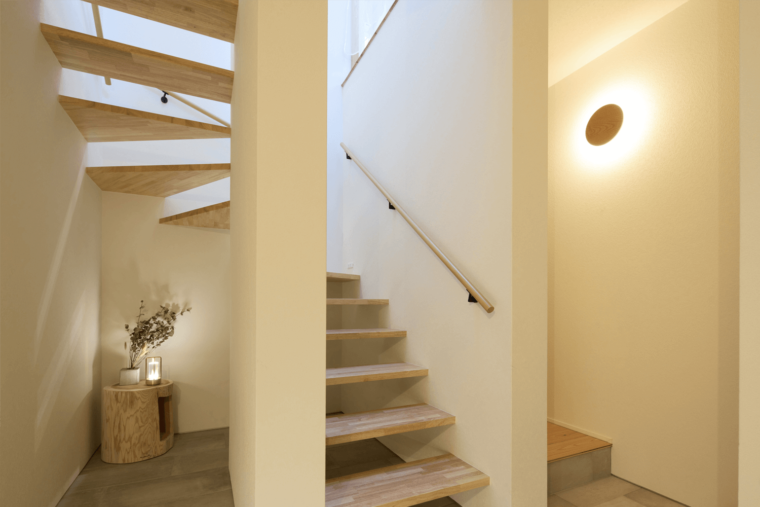 また、階段の腰壁を取り払い、木製のシースルー手摺を採用することで、LDKとのつながりをより感じられる設計としています。
