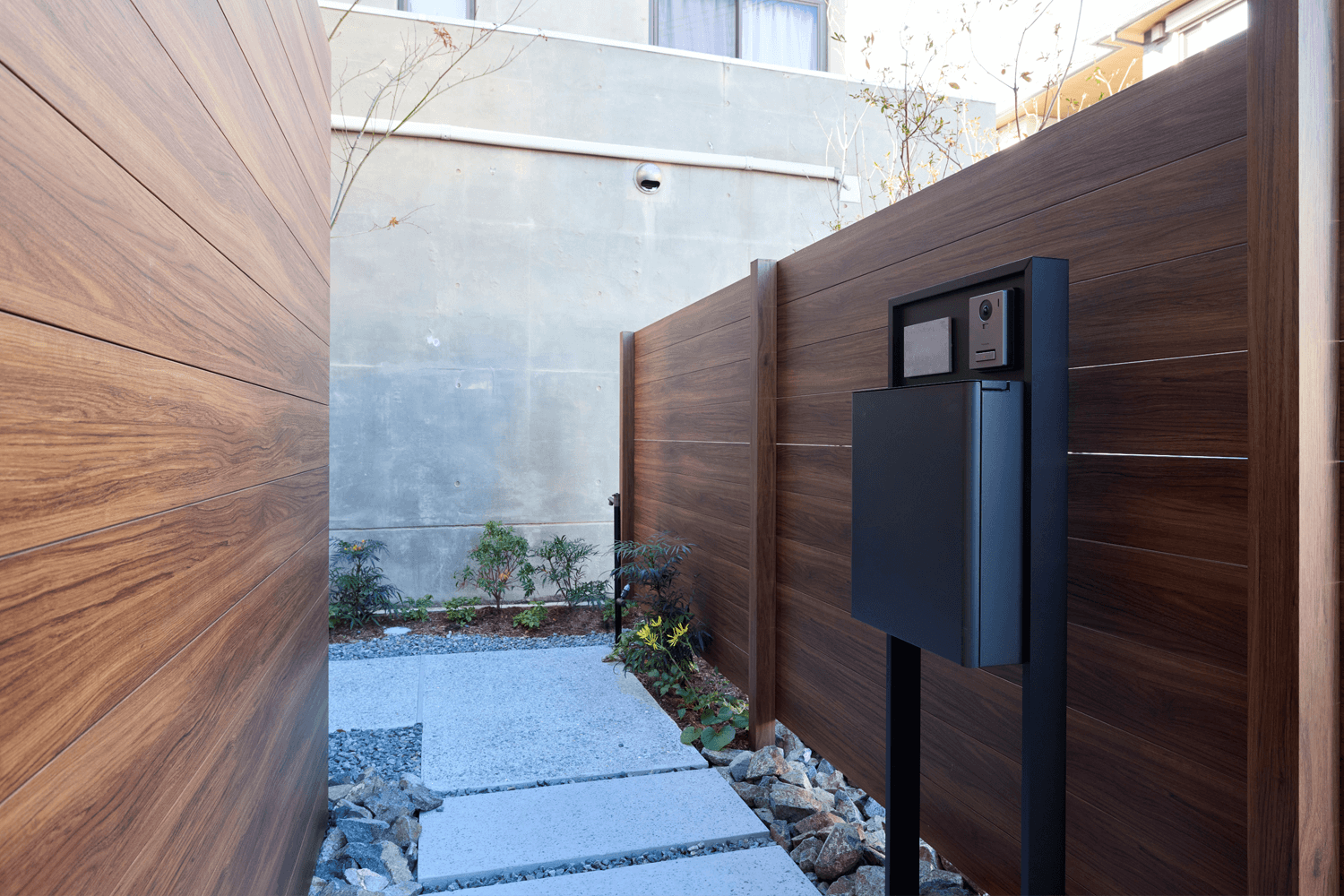 アプローチでは、背の高い木調アルミフェンスを前後に設け、その間をジグザグに歩いていくスタイルをご提案しました。
