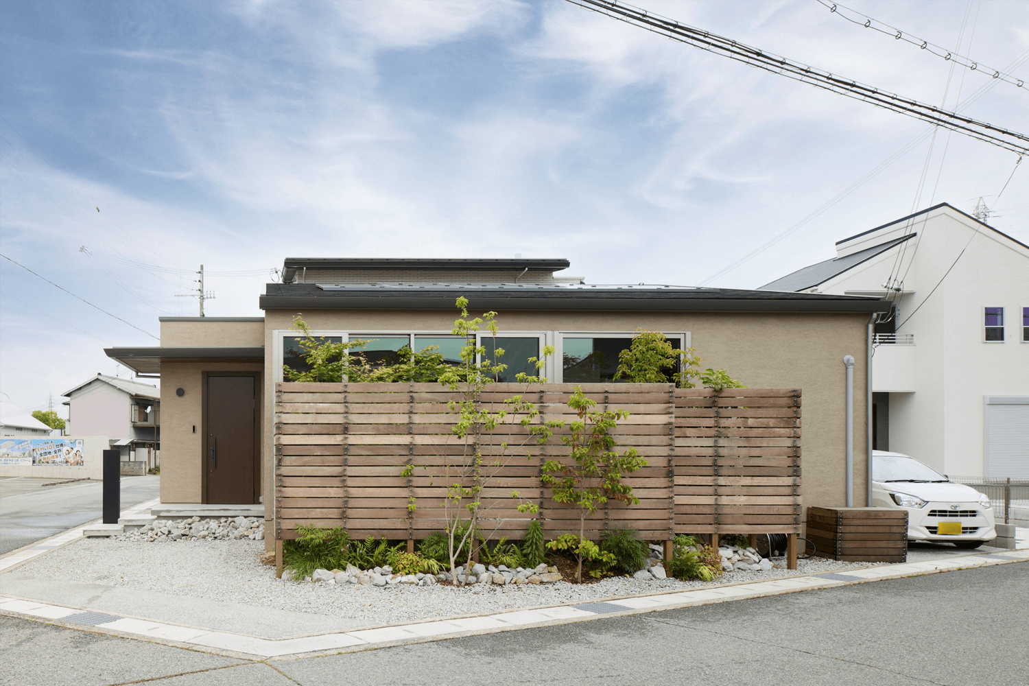 約51坪の南東の角地に建った約24坪の平屋「小さな回廊の箱」。