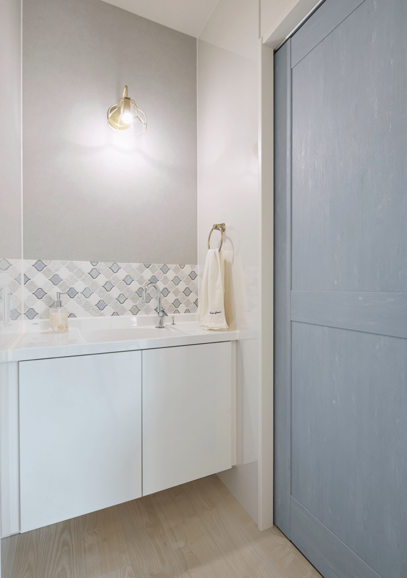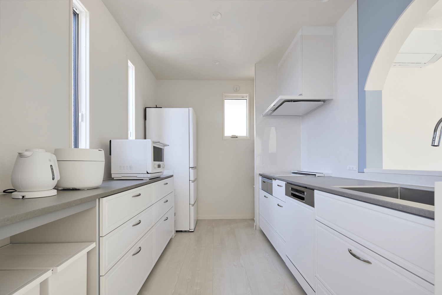 キッチンは生活感を抑えるためセミクローズ型とし、ティファニーブルーのクロスをアクセントに。