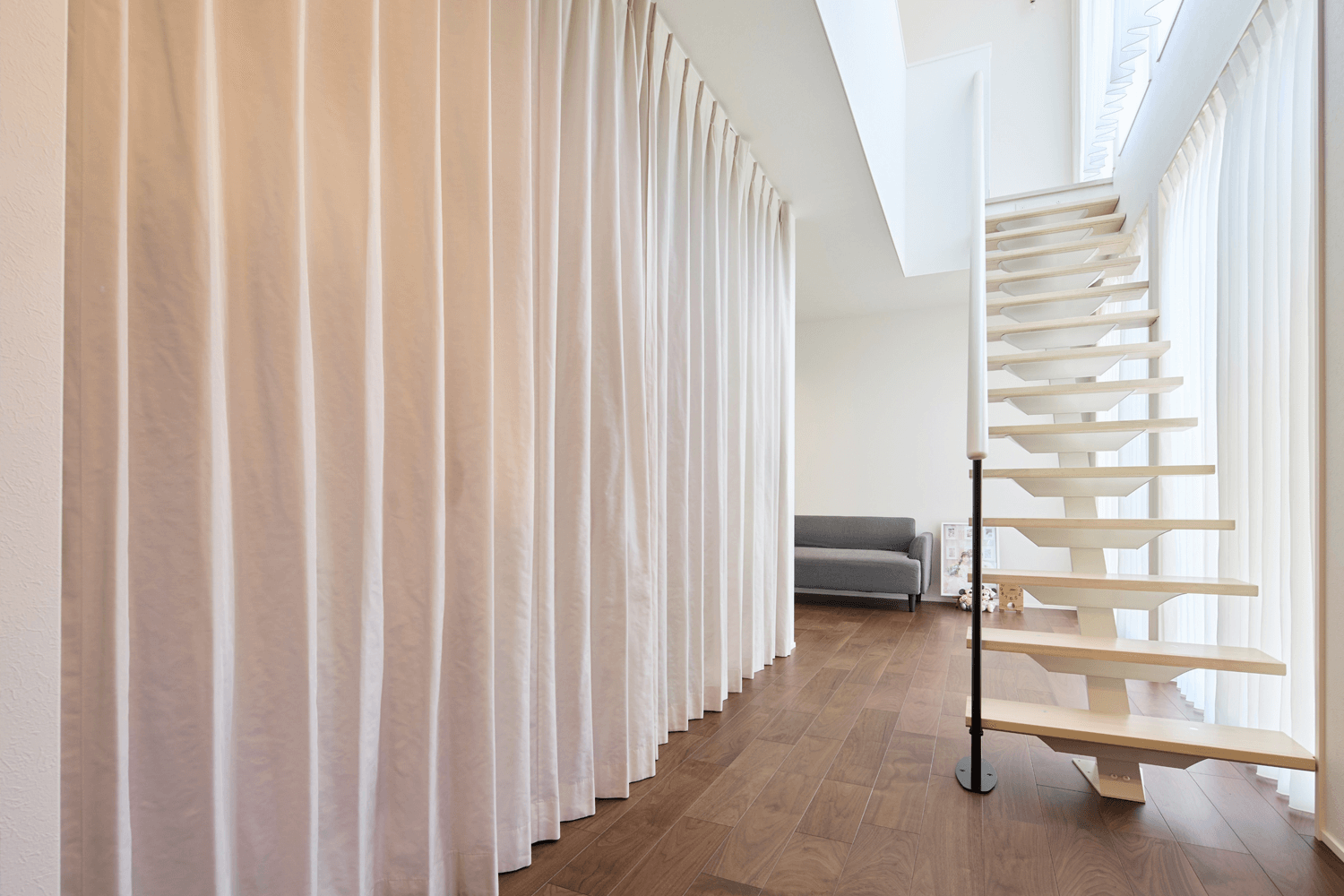 玄関収納は建具をなくし、レースカーテンで覆うことで柔らかさをプラスしています。