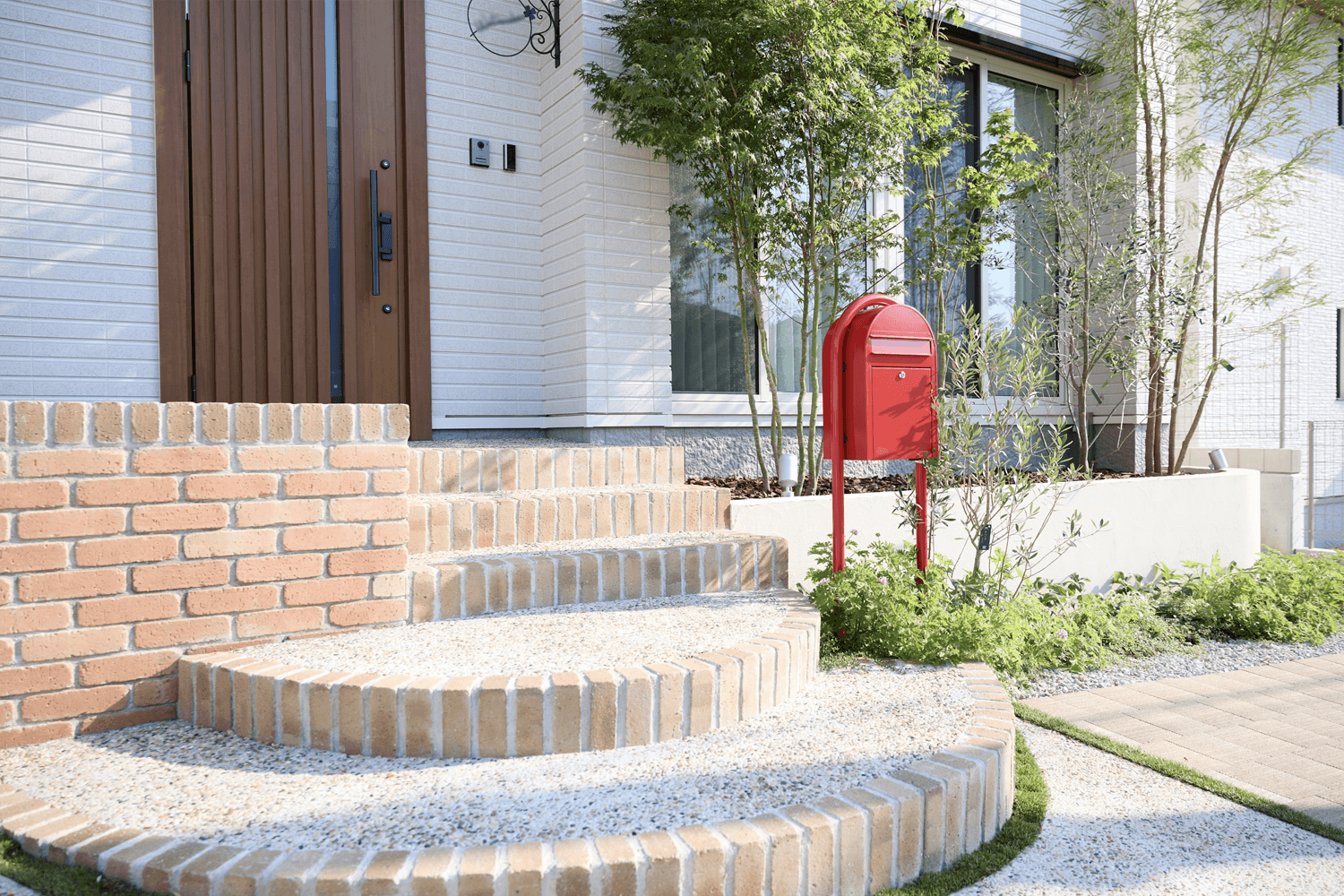 印象的な赤いポストとオレンジのレンガ花壇が、可愛らしさと温かみを添えます。