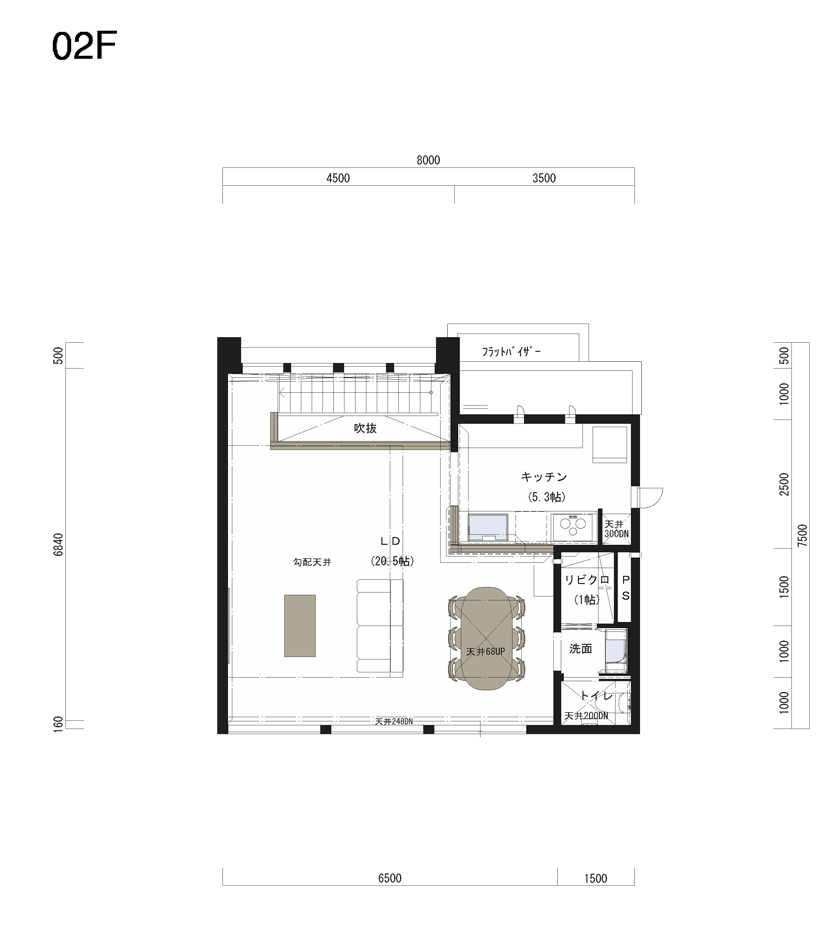 さらに、リビングの開放感をより高めるため、天井を一部折り上げて吹抜けにしています。