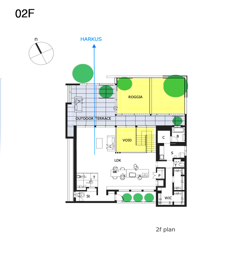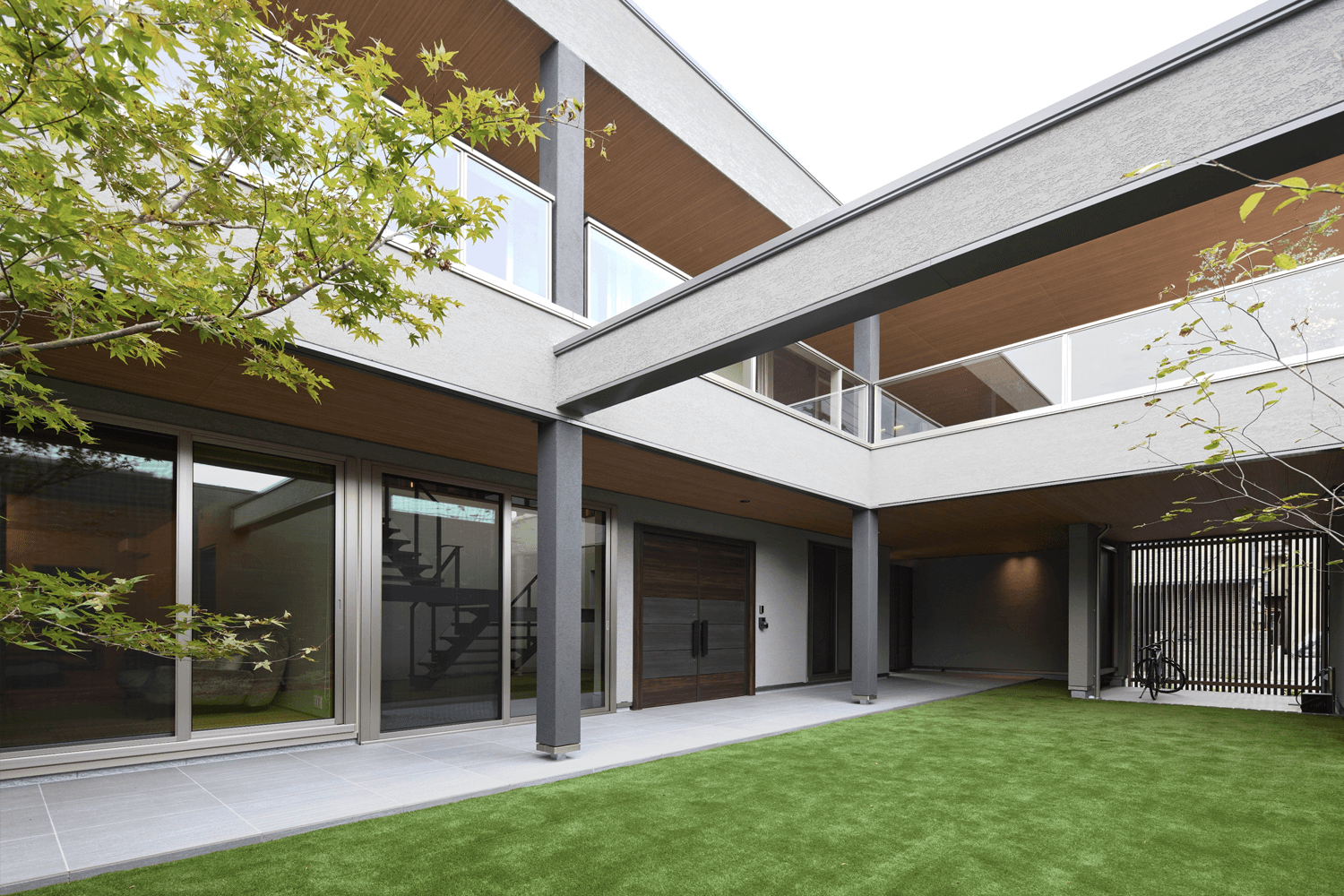 #挽板 #無垢床 #吹抜 #シースルー階段 #アイランドキッチン #中庭 #コートハウス #人工芝 #ニューライトポタリーDesign Plan