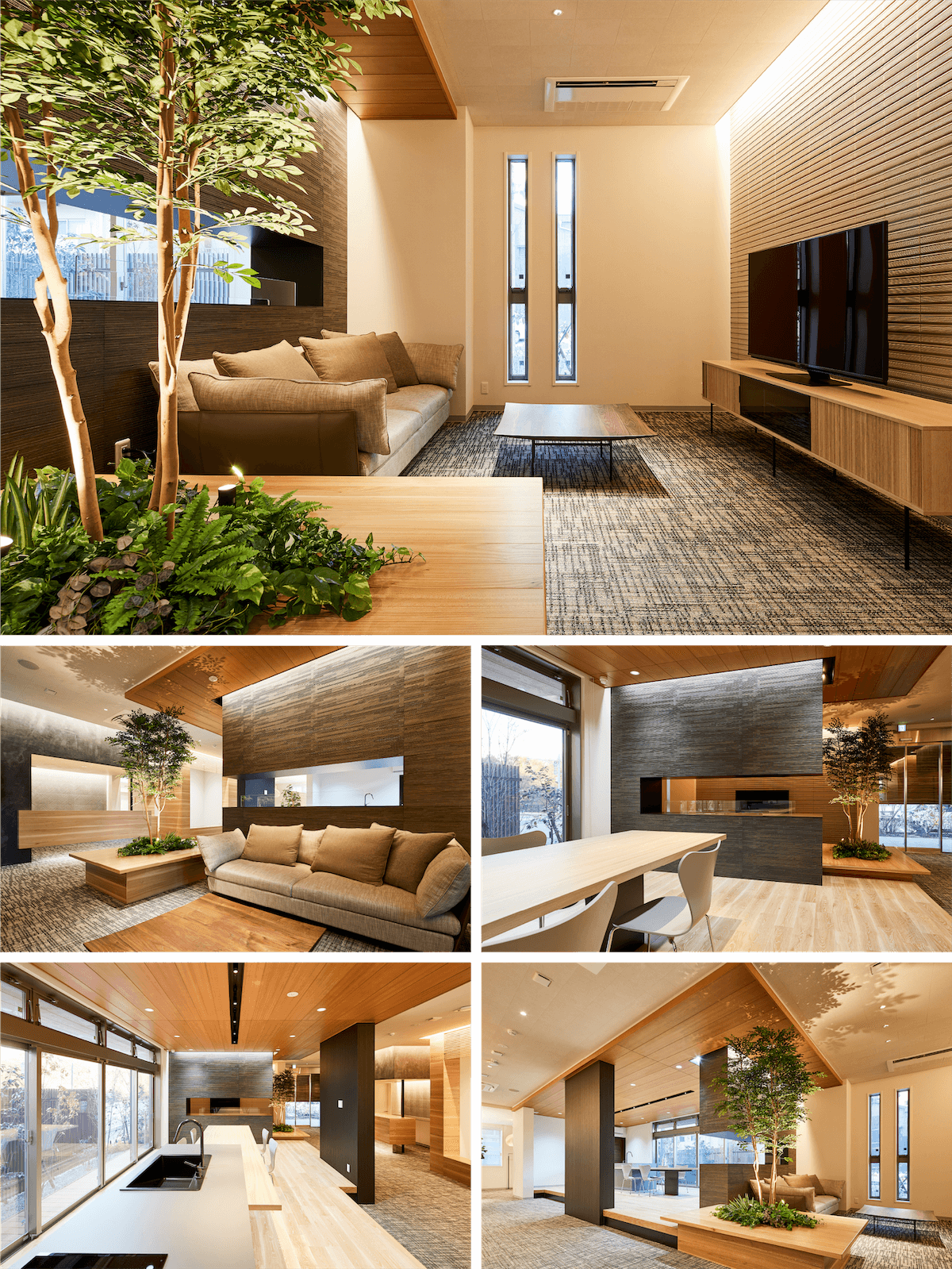 エントランスから、待合スペース、キッズスペース、打合せスペースへ「樹」が続きます。インテリアは親しみを感じさせる木調の素材とアクセントとなるブラックの素材で全館統一。キッチンスペースの床・天井は木板貼りとしナチュラルな空間としつつ、待合スペースには焼き物外壁、エタノール暖炉まわりはタイル貼り、受付はモールテックスの塗り壁など質感で変化を持たせ、上質なカフェインテリア空間を演出しました。ソファーやダイニングテーブルなどのデザイナーズ家具も実際にご体感頂けます。