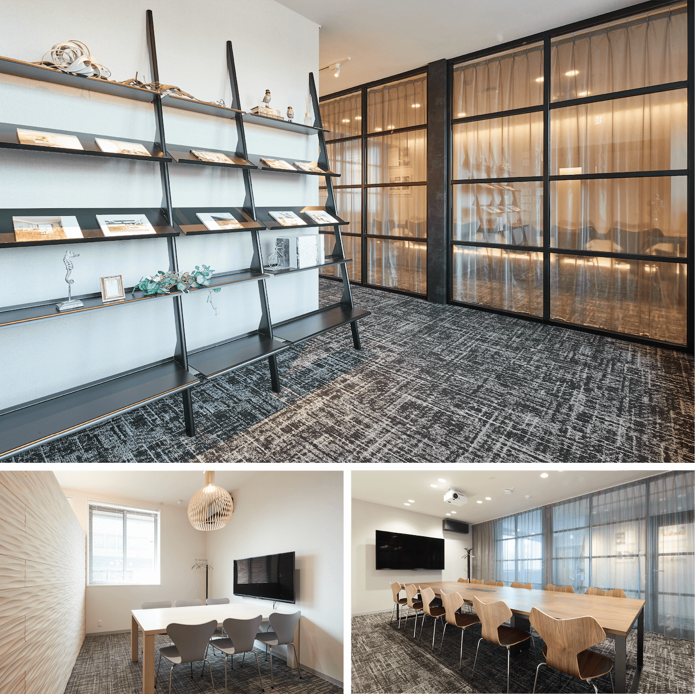 大型打合せブースでは4mの突板テーブルを配置し、150インチの大型スクリーンにプロジェクターでプレゼンテーションすることが可能です。インテリアは1階と同じく木彫とブラックで統一。ダークグレーのタイルカーペット床に木調ルーバーやアイアン格子を用い、落ち着きのある空間としました。打合せブース内のテーブルやチェアはブース毎に異なった家具を配置していますので様々な家具に触れて頂くことができます。