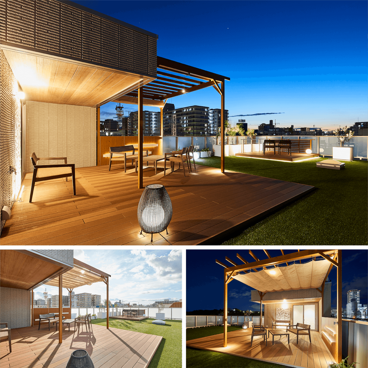 屋上スペースにもリゾートカフェをイメージした空間を配置して、屋外での打合せやランチのスペースなどソトの使い方の提案をしています。