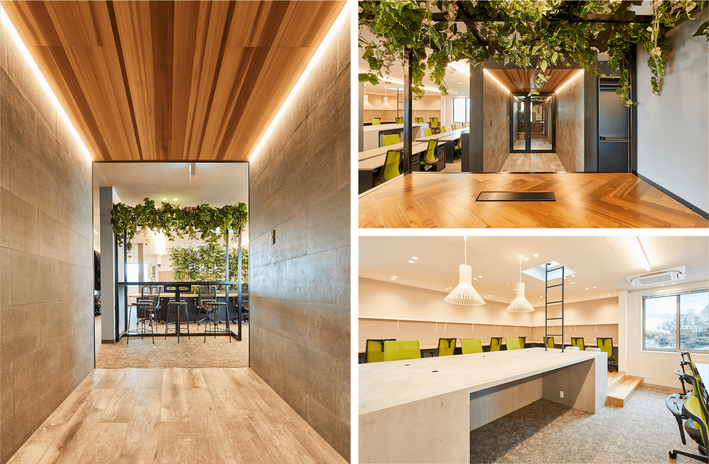 トンネル状のエントランスを抜けて広がるオフィス空間の真ん中にはシンボリックな木を配置し、空間を柔らかく隔てています。フリーアドレスを採用することで壁際や窓際のカウンター席、向かい合った席など気分に合わせて自由に座ることができ、プロジェクト単位で座ってディスカッションするなど効率的なオフィスワークを行っています。